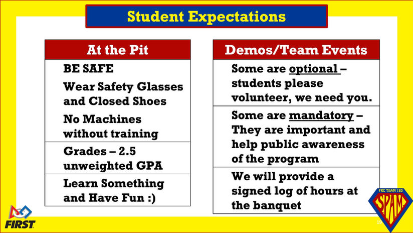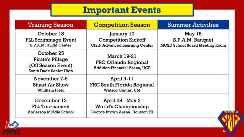 Costs: $250 registration (includes FIRST fee, shirts, and initial travel); competitions $350-750 (sponsorships help!).