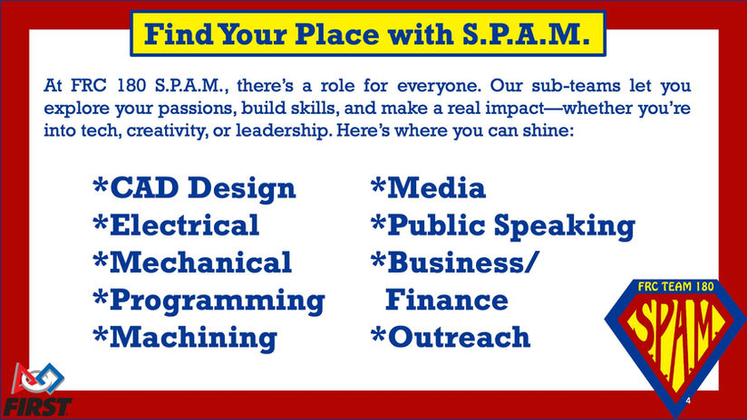 Thank you for your interest in S.P.A.M. (Speed, Power, and Maneuverability) Robotics Inc., FRC Team 180. We're thrilled to have you as part of our community as we inspire the next generation of STEM innovators on the Treasure Coast. This page is your hub for everything you need to know about supporting your student, registering for the program, and getting involved yourself. Our mission is to promote STEM growth through hands-on robotics, and your involvement makes it all possible.