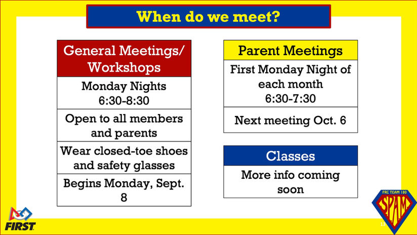 Meetings? Mondays 6:30-8:30 PM at the S.P.A.M. STEM Center. Starts Sept 8!